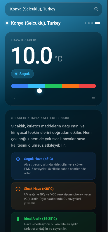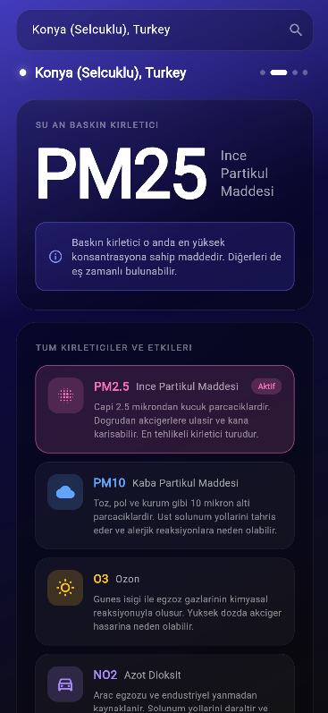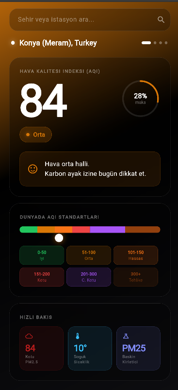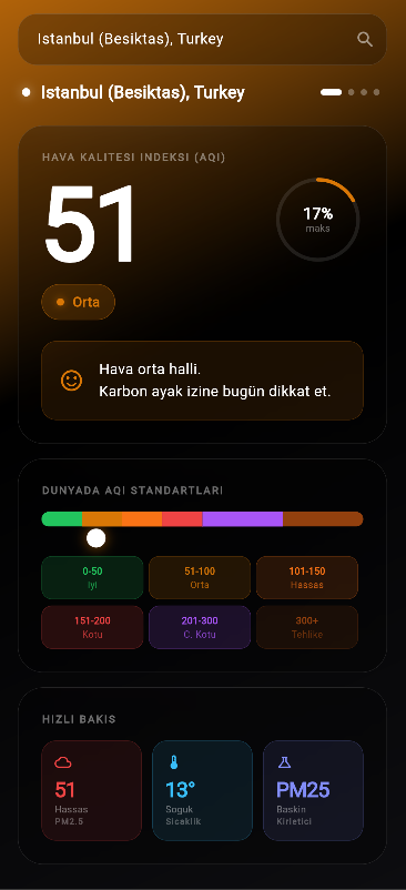 Flutter kullanılarak geliştirilen ve dünya genelinde hava kalitesi ile hava durumu verilerini anlık olarak takip eden yapay zeka tabanlı bir mobil platformdur. PM2.5 ve PM10 gibi kritik partikül madde seviyelerini izleyen sistem, toplanan verileri Supabase üzerinde depolayarak geçmiş veri analizi yardımıyla ileriye dönük temizlik tahminleri üretmektedir. Global kapsama alanı sayesinde her konumda çalışabilen proje, henüz başlangıç aşamasında olup çevresel verileri anlamlı içgörülere dönüştürerek kullanıcıların hava kalitesi değişimlerini öngörmesini sağlamayı hedeflemektedir.