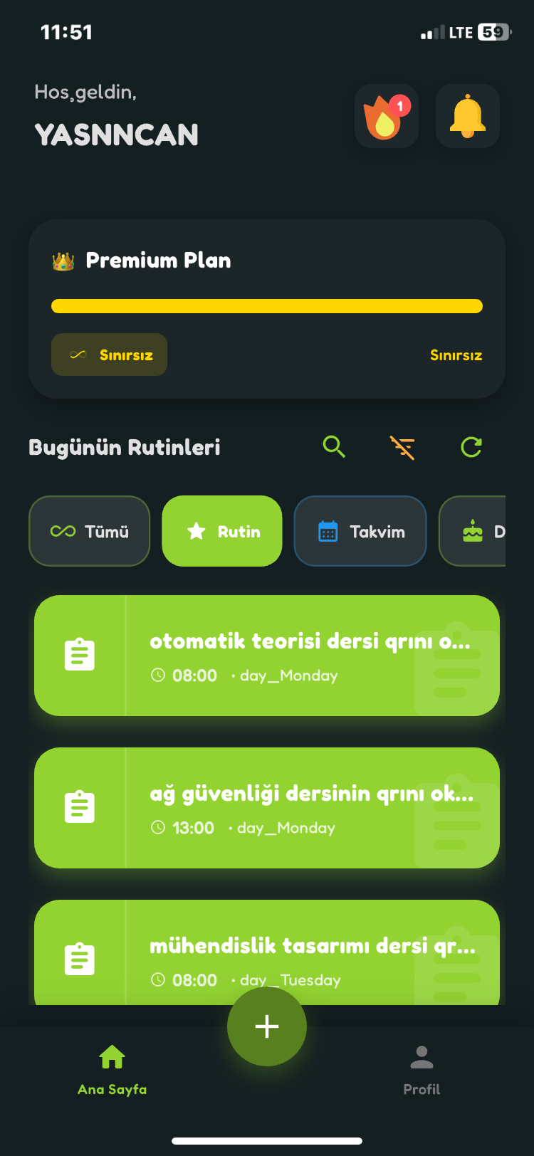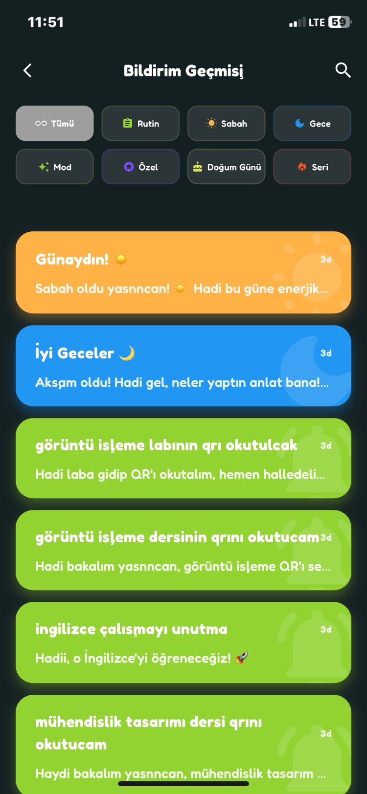 Flutter ve Node.js teknolojileriyle geliştirilmiş, yapay zeka desteğiyle kişiselleştirilmiş bir asistan deneyimi sunan modern bir prodüktivite ve hatırlatıcı uygulamasıdır. Kullanıcının seçtiği yapay zeka stiline göre (samimi, disiplinli vb.) özel cevaplar ve bildirimler üreten sistem; günlük, tarihsel ve özel gün hatırlatıcılarını gelişmiş filtreleme ve arama özellikleriyle sunar. Google ve Apple giriş seçeneklerine sahip üyelik yapısı ve geçmiş bildirimleri görüntüleme imkanıyla kullanıcı deneyimini zenginleştirir. Günlük girişleri takip eden motivasyon sistemiyle sürekliliği artıran uygulama, şu an test aşamasında olup kullanıcıların günlük rutinlerini daha akıllıca yönetmelerini hedefleyen en güncel projelerden biridir.