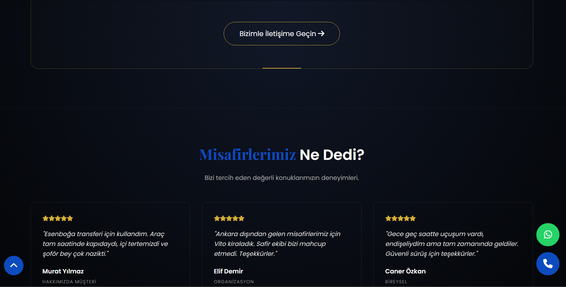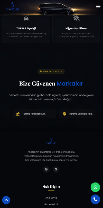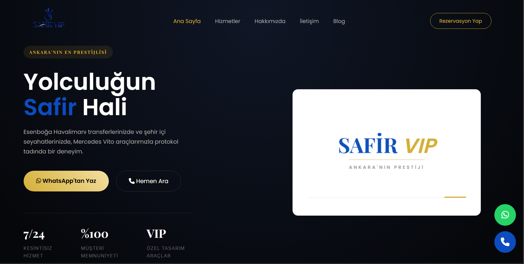 VIP transfer sektörü için HTML ve CSS kullanılarak geliştirilmiş, prestij odaklı kurumsal bir web sitesidir. Tasarımda tercih edilen sarı ve altın tonlarıyla markanın premium hizmet anlayışı ve güven algısı ön plana çıkarılmıştır. Tamamen statik bir mimariyle kurgulanan site, bu sayede yüksek sayfa açılış hızı ve güçlü SEO performansı sunmaktadır. Mobil cihazlar dahil tüm ekran boyutlarıyla tam uyumlu (responsive) çalışan arayüz, kullanıcıların rezervasyon ve bilgi taleplerini doğrudan WhatsApp hattına yönlendirerek hızlı bir iletişim akışı sağlamaktadır.